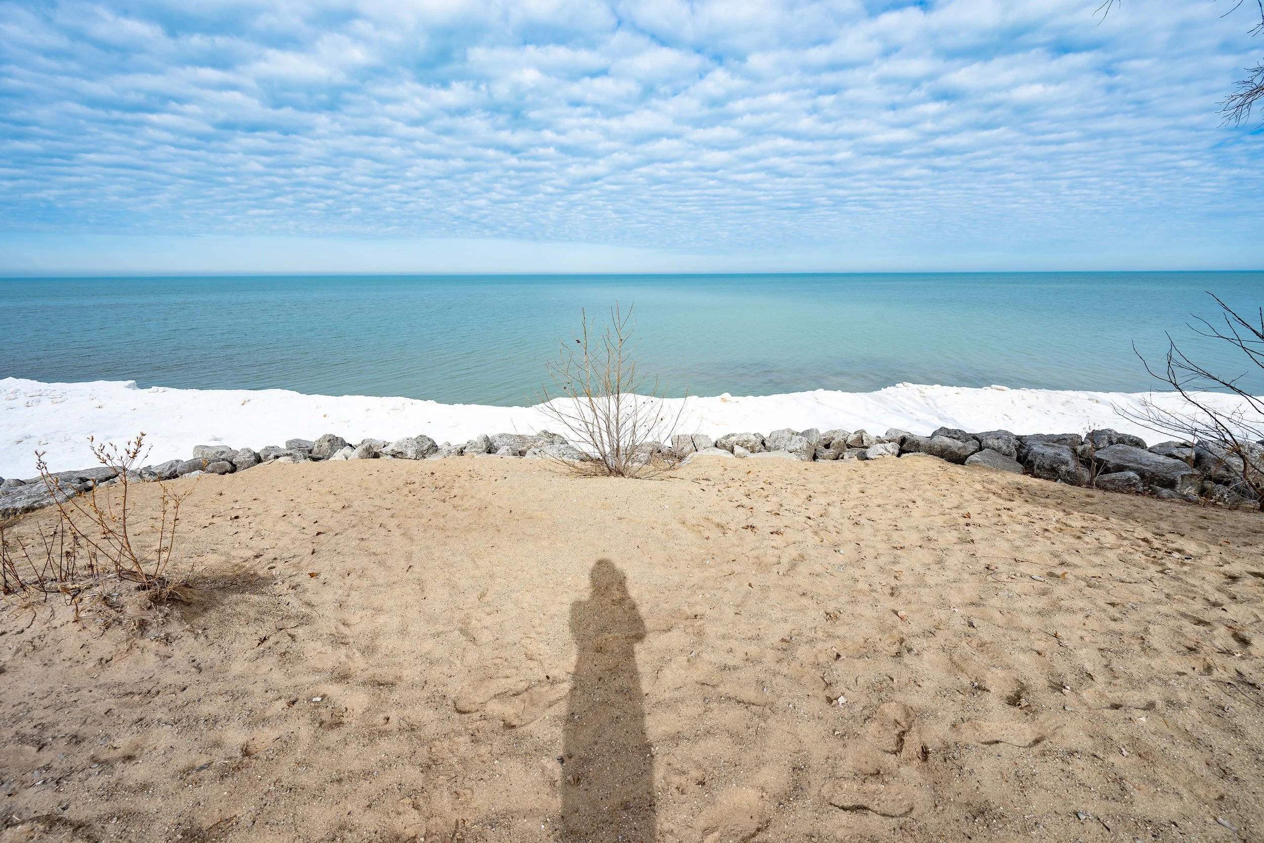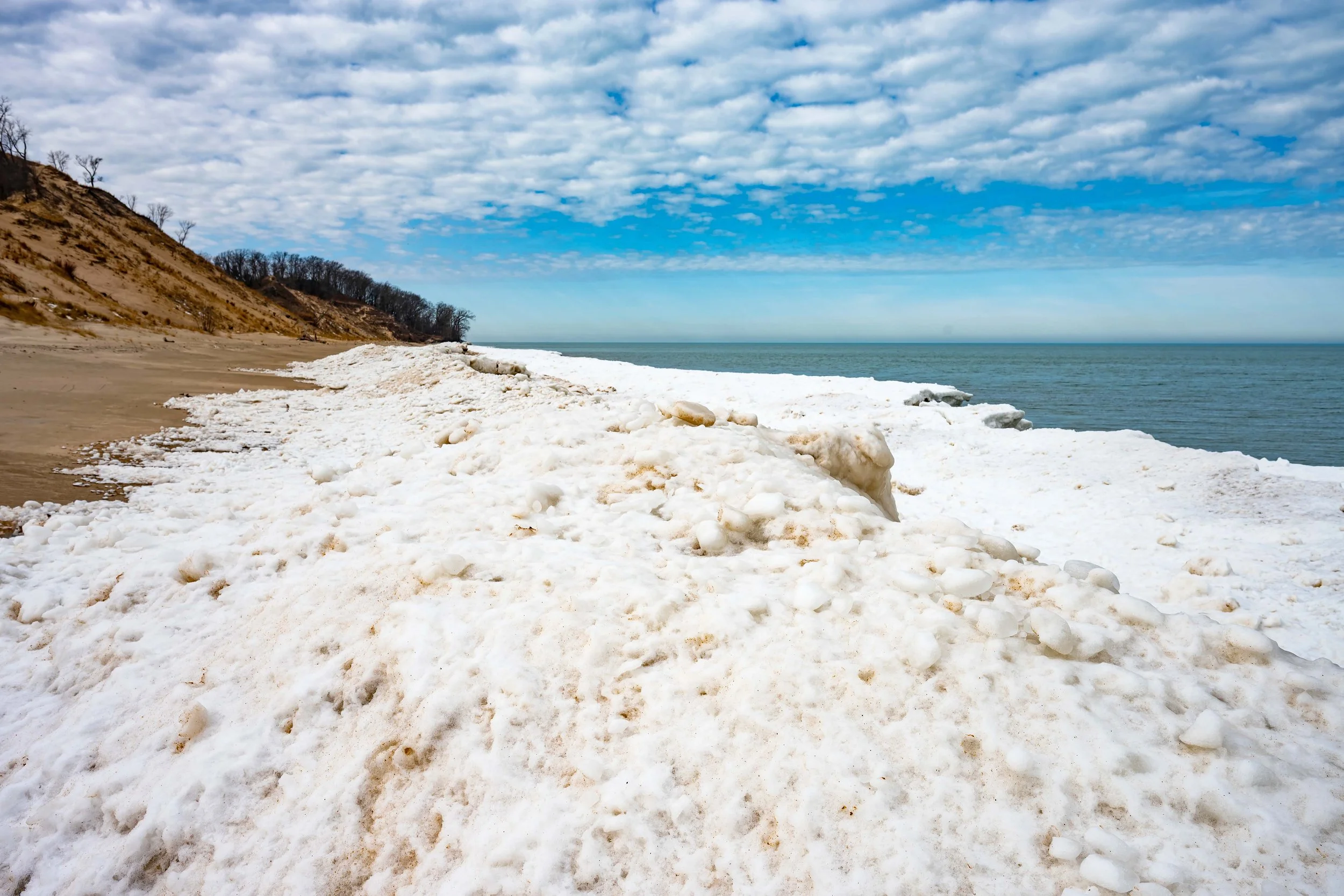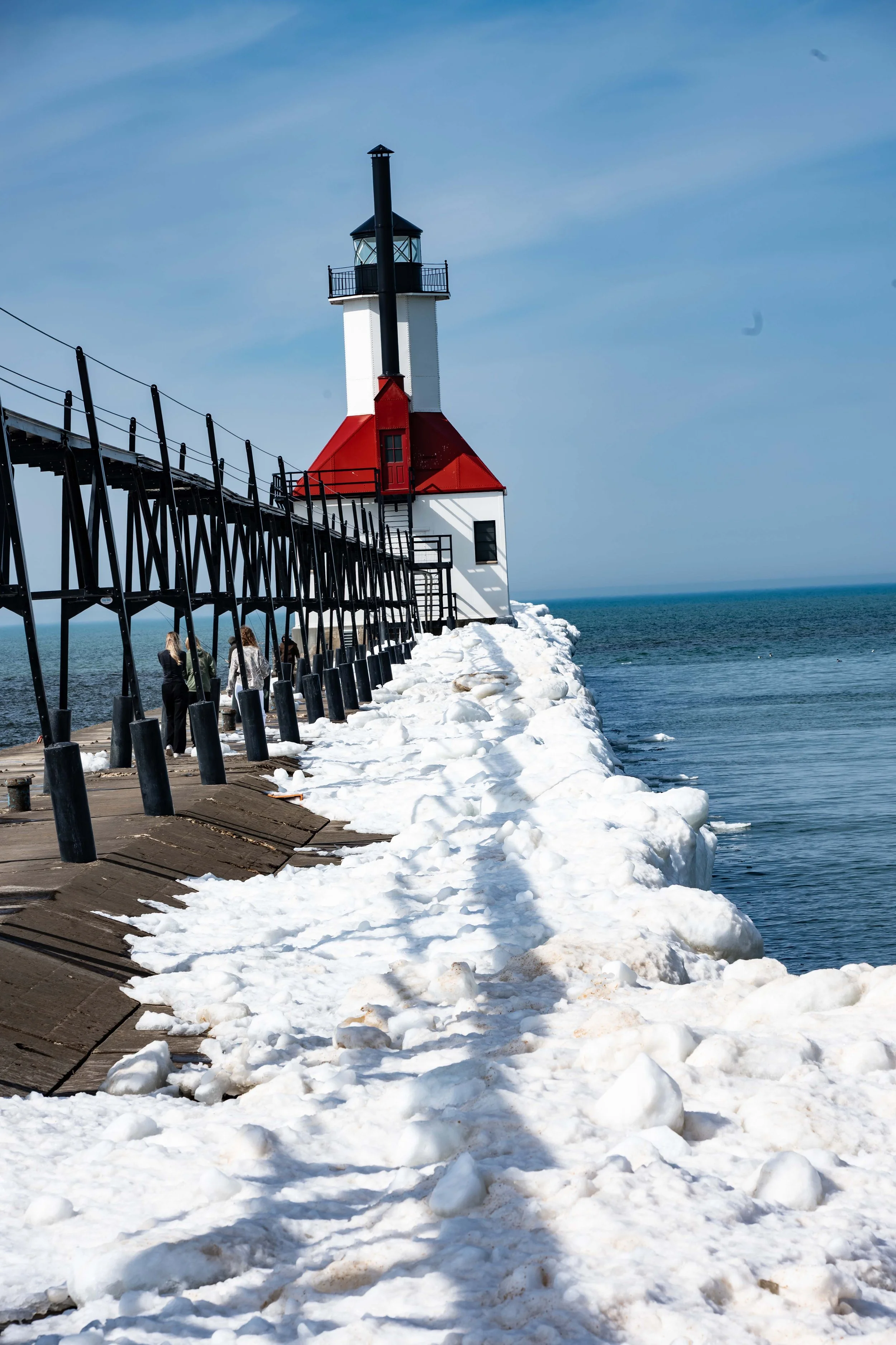 When I was there at the end of January and early February, the ice formations were unreal. Thick, sculpted, dramatic. I was secretly hoping for crashing waves and leftover ice drama yesterday… but Lake Michigan had other plans.