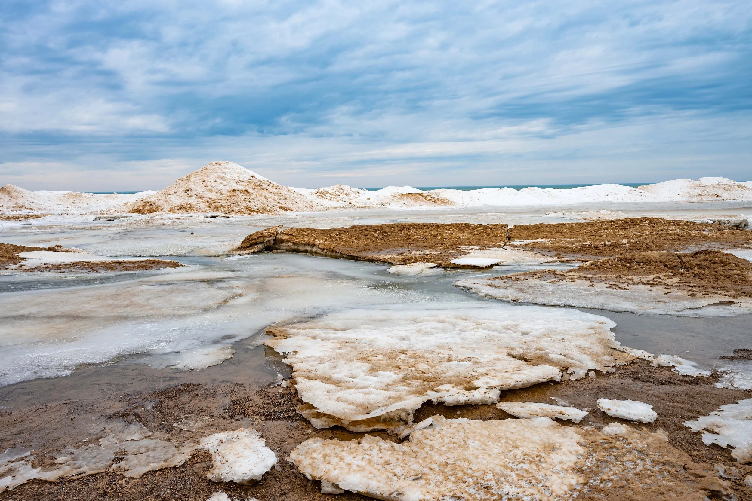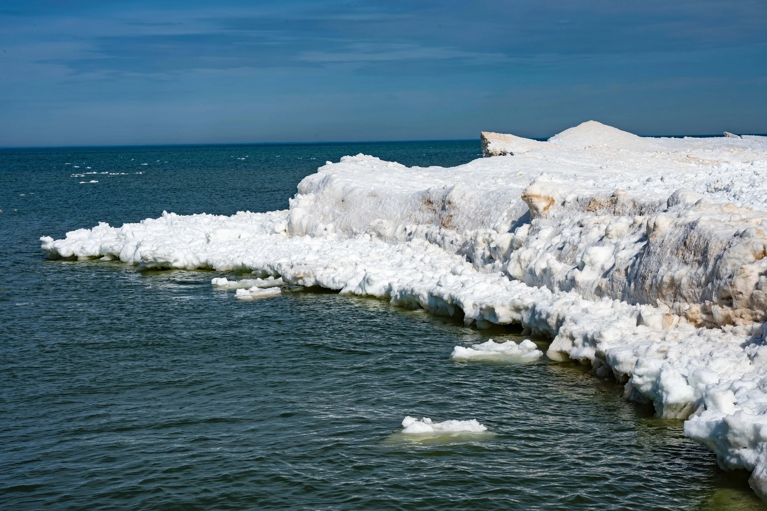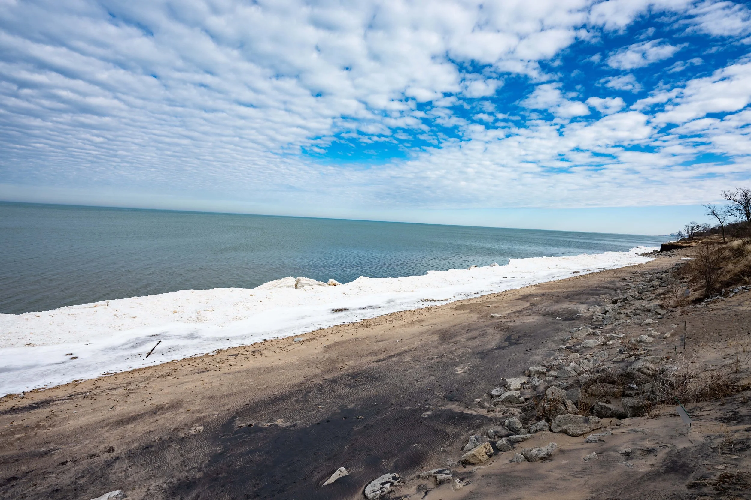 When I was there at the end of January and early February, the ice formations were unreal. Thick, sculpted, dramatic. I was secretly hoping for crashing waves and leftover ice drama yesterday… but Lake Michigan had other plans.