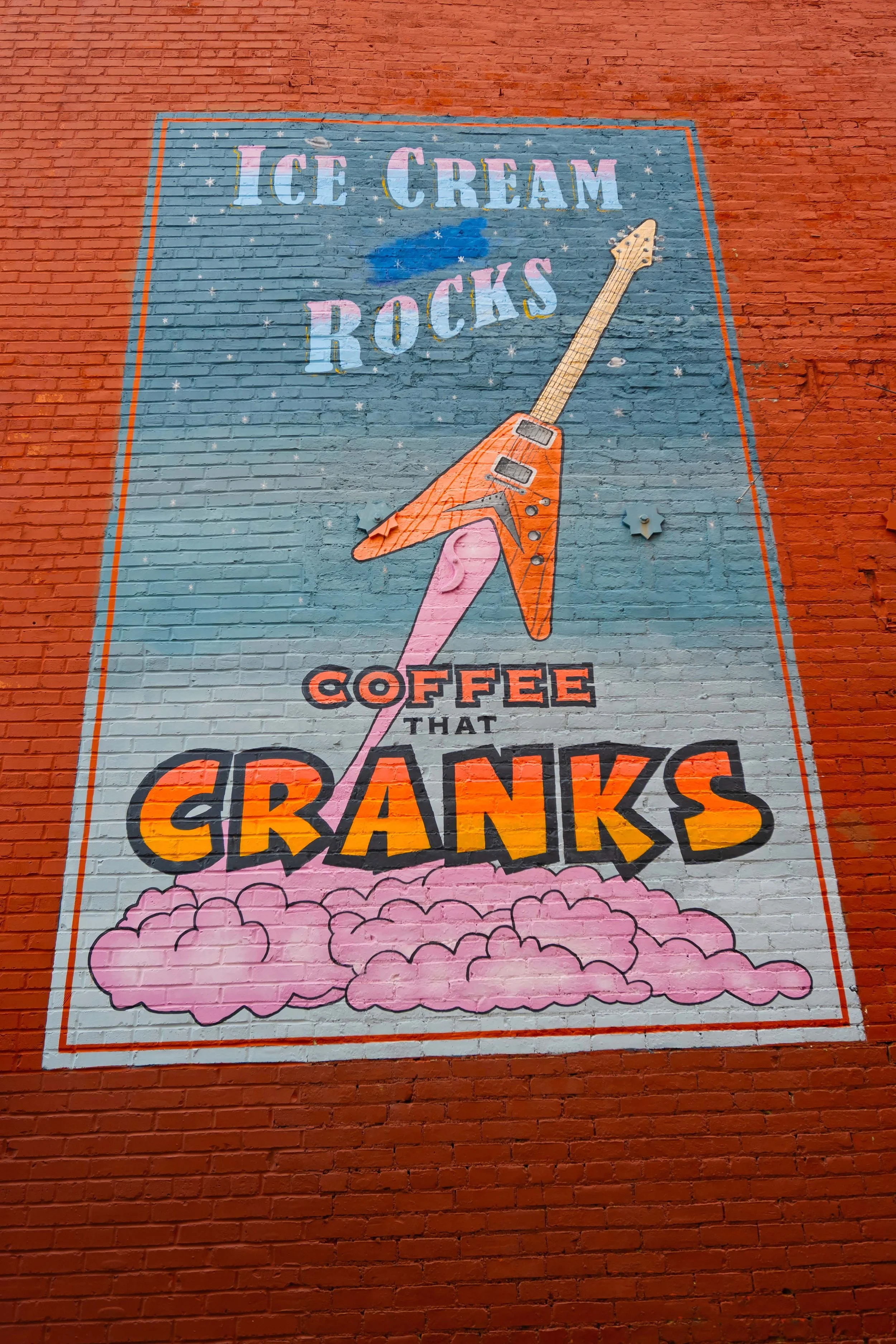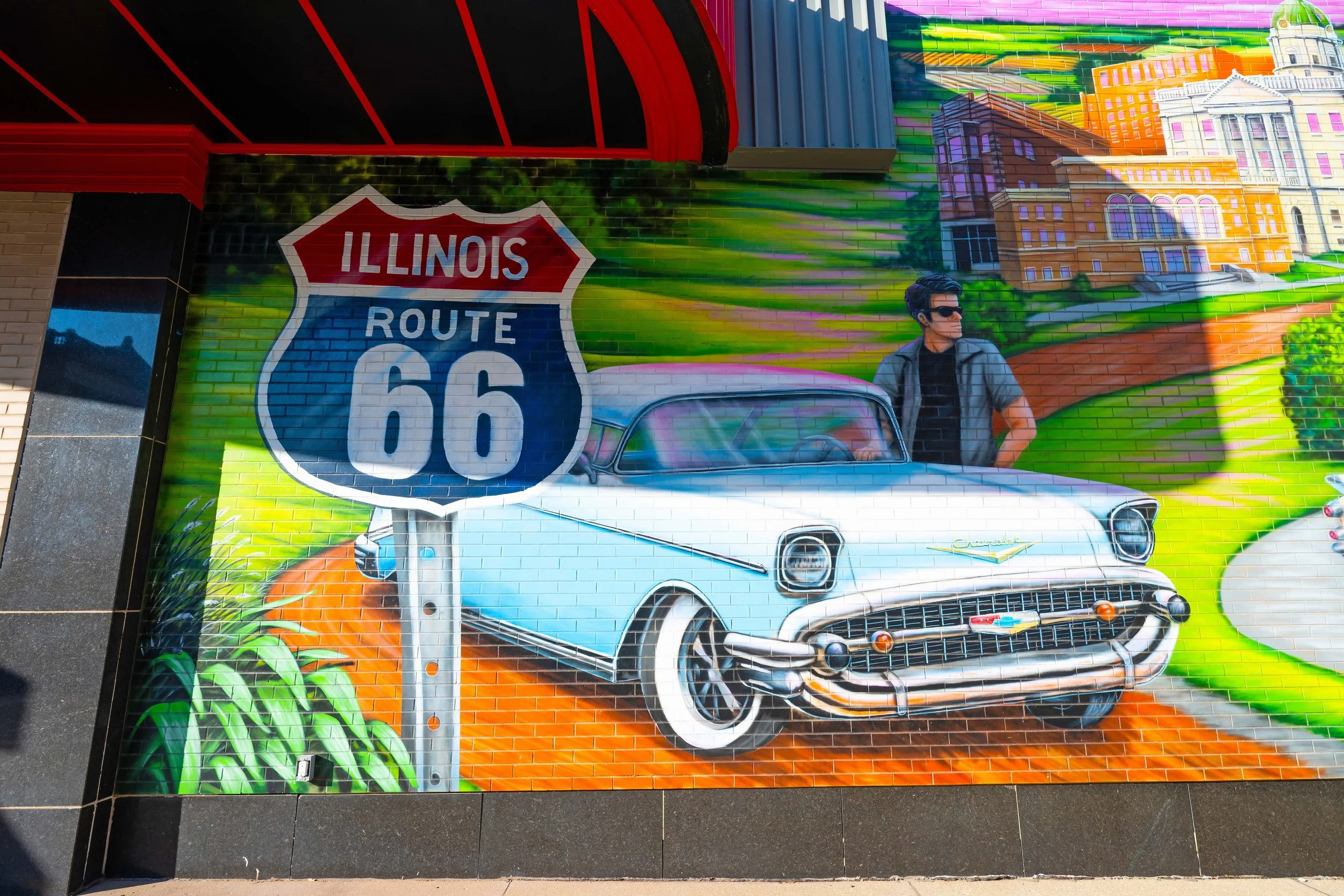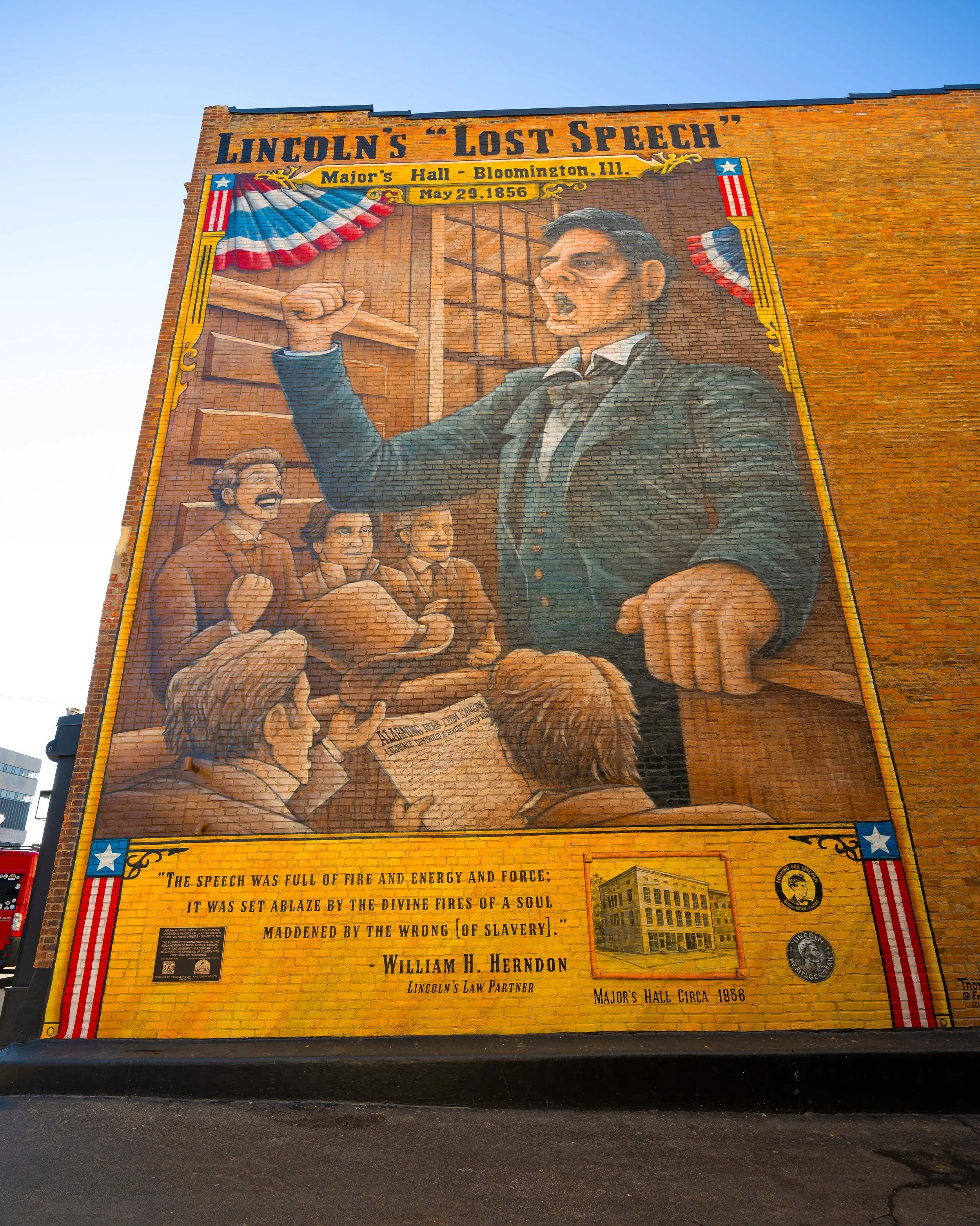 The murals downtown have so much personality. The big Route 66 “Welcome to Bloomington” one. The Lincoln “Lost Speech” mural. The bold colors, the brick, the history layered right into the walls. Even the fun ones — “Ice Cream Rocks. Coffee That Cranks.” They make you smile.