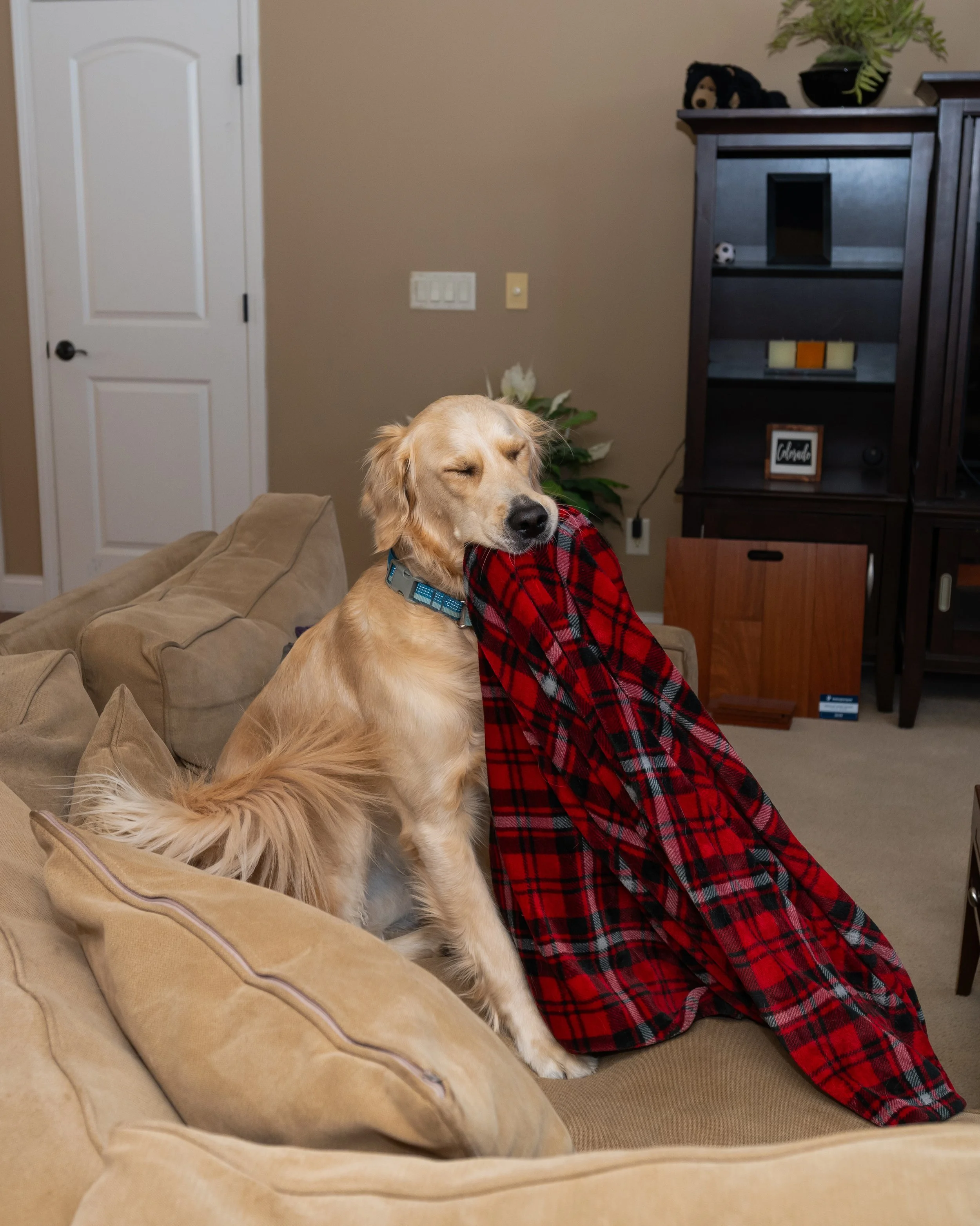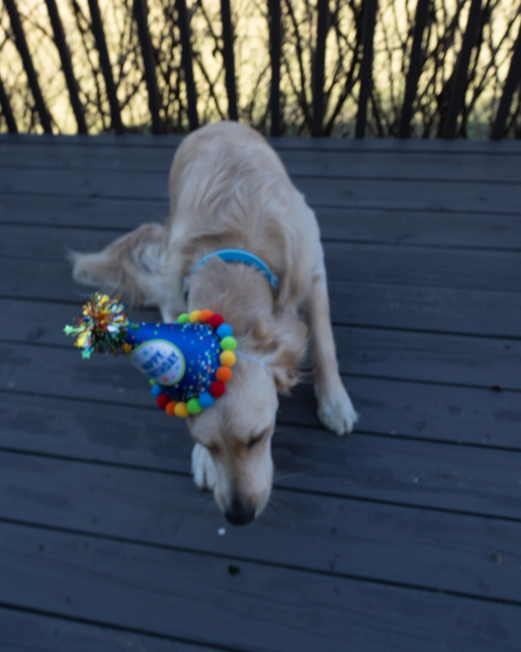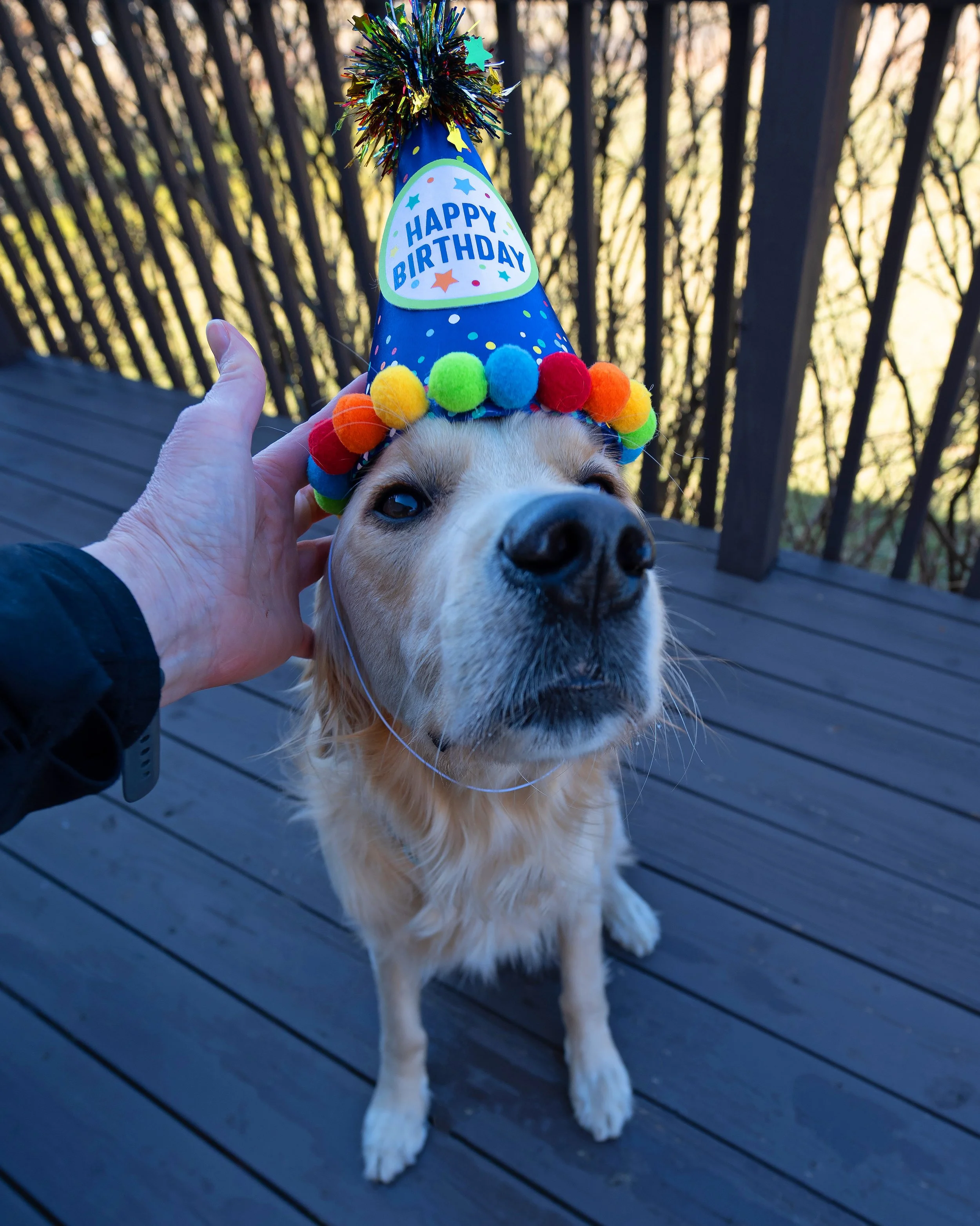 Some of my favorite photos from today aren’t the polished ones. They’re the real ones — him on the couch with a plaid blanket hanging from his mouth, him sniffing the deck with his birthday hat sliding sideways, candles flickering behind cupcakes he’s pretending not to notice.