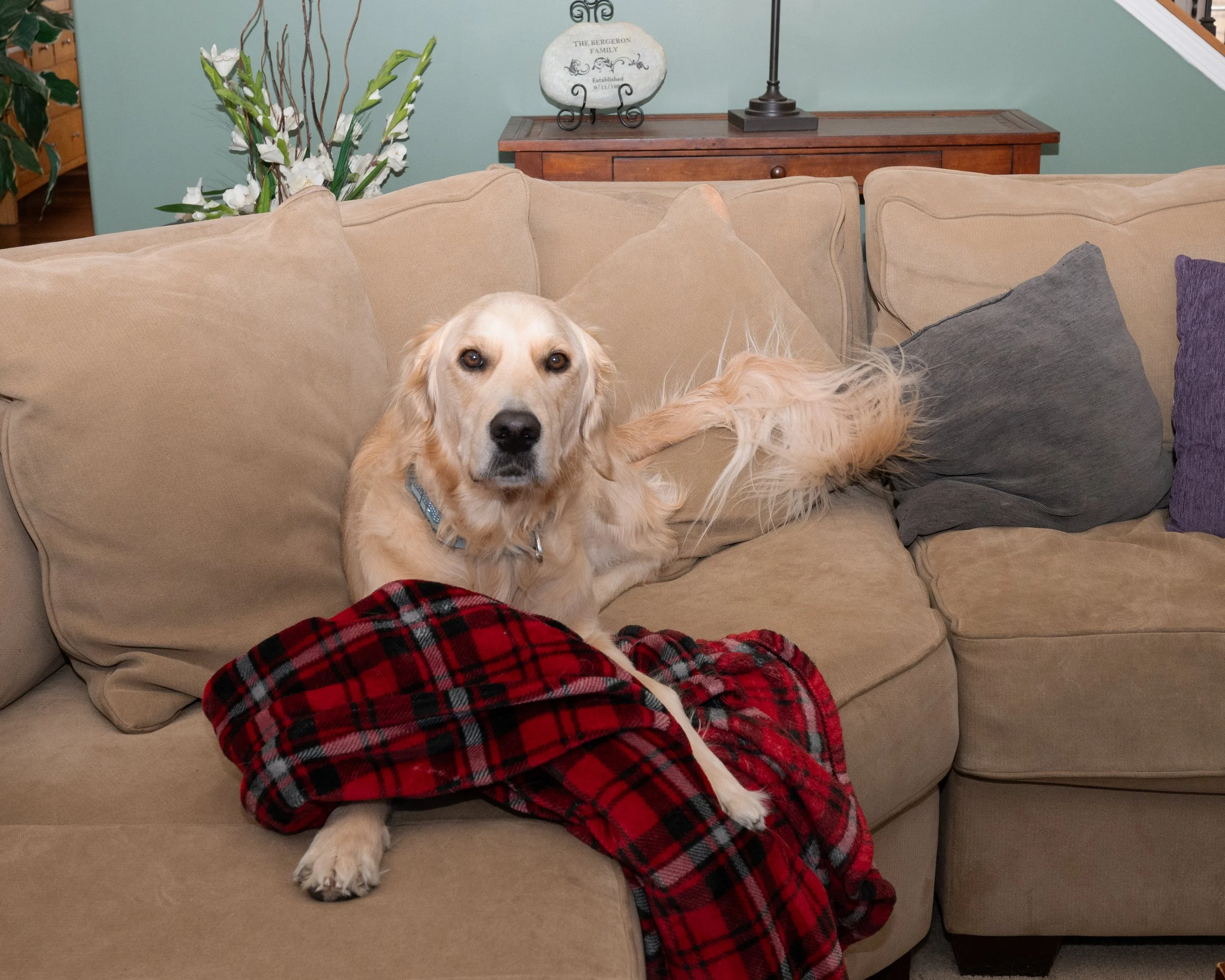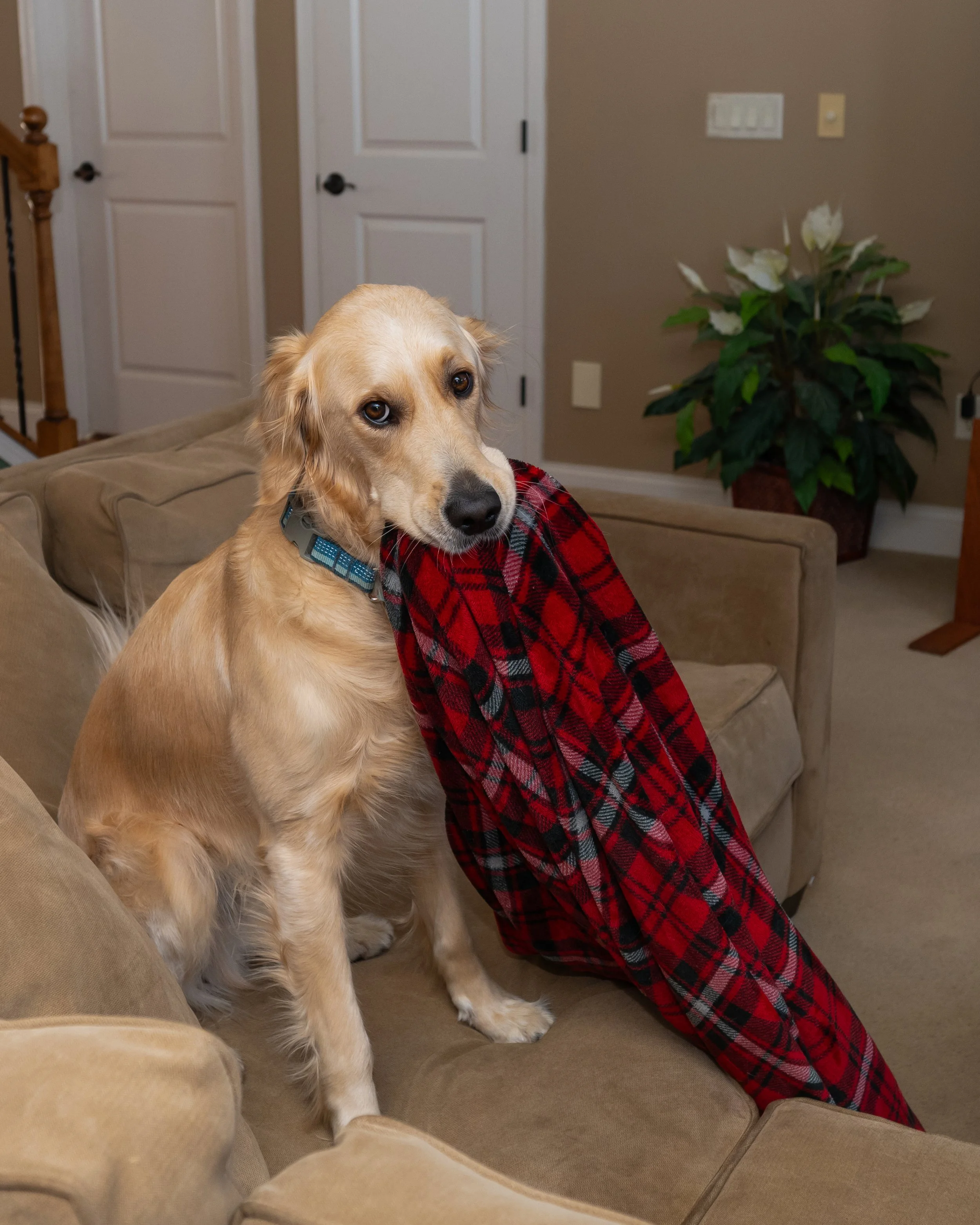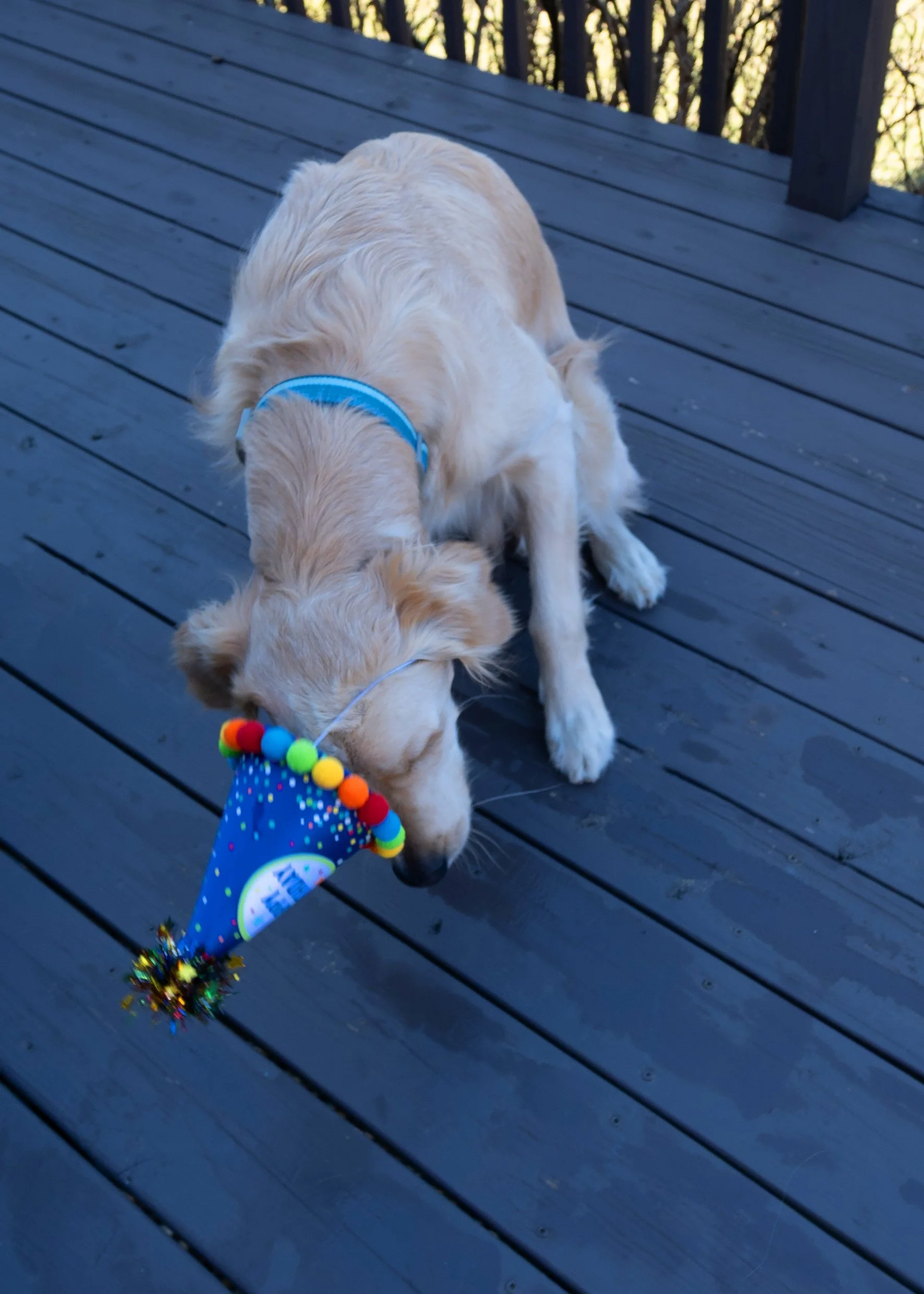 Some of my favorite photos from today aren’t the polished ones. They’re the real ones — him on the couch with a plaid blanket hanging from his mouth, him sniffing the deck with his birthday hat sliding sideways, candles flickering behind cupcakes he’s pretending not to notice.