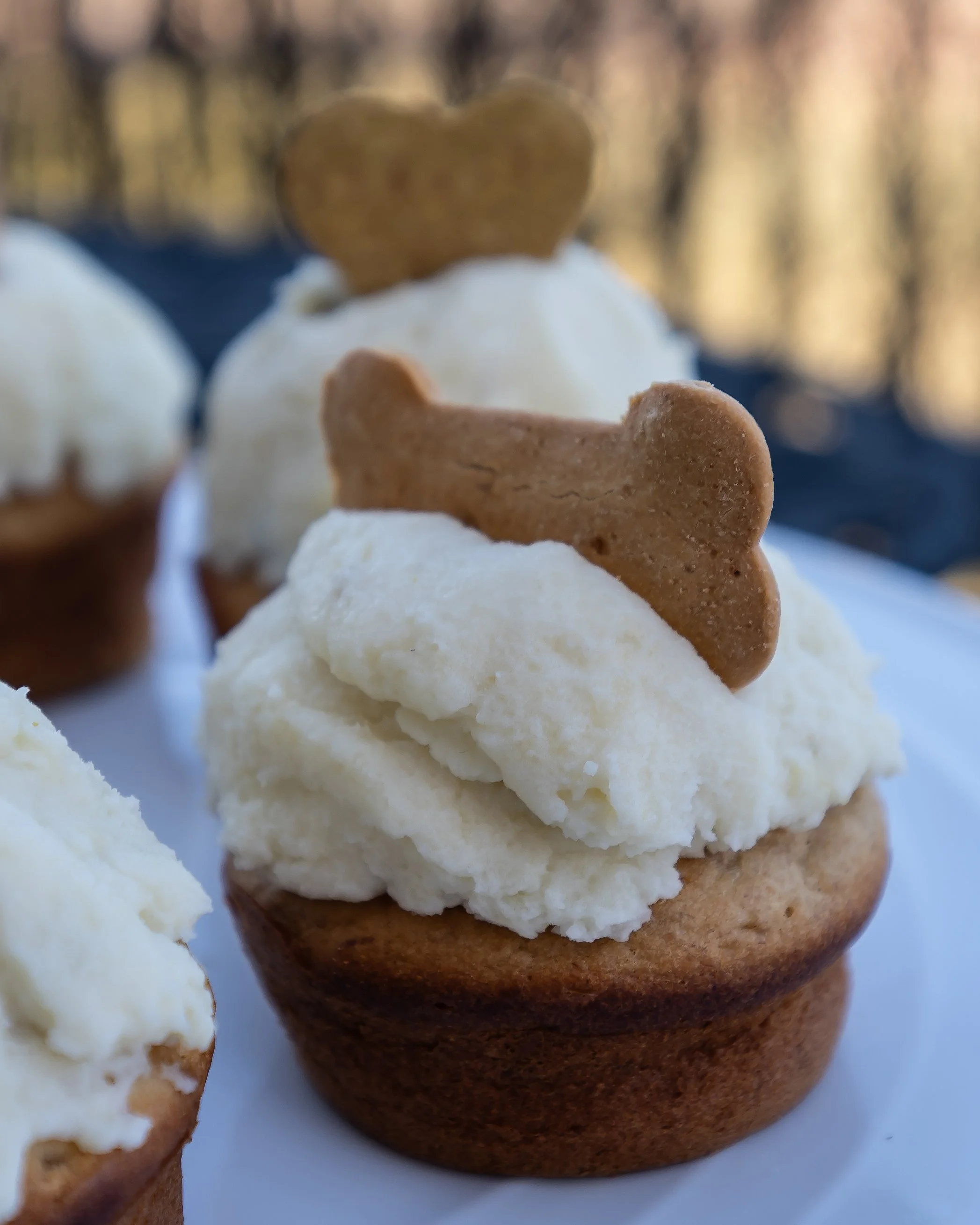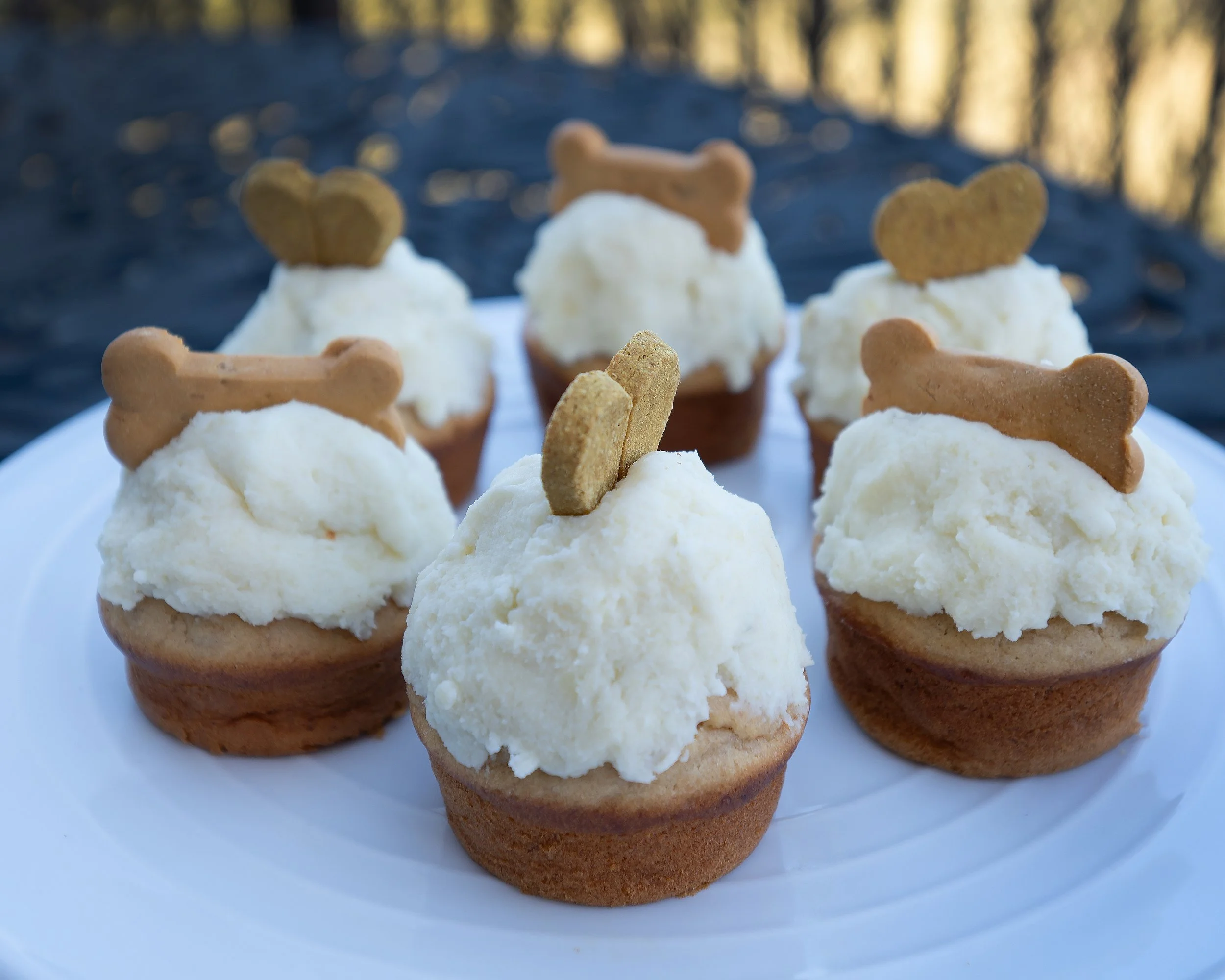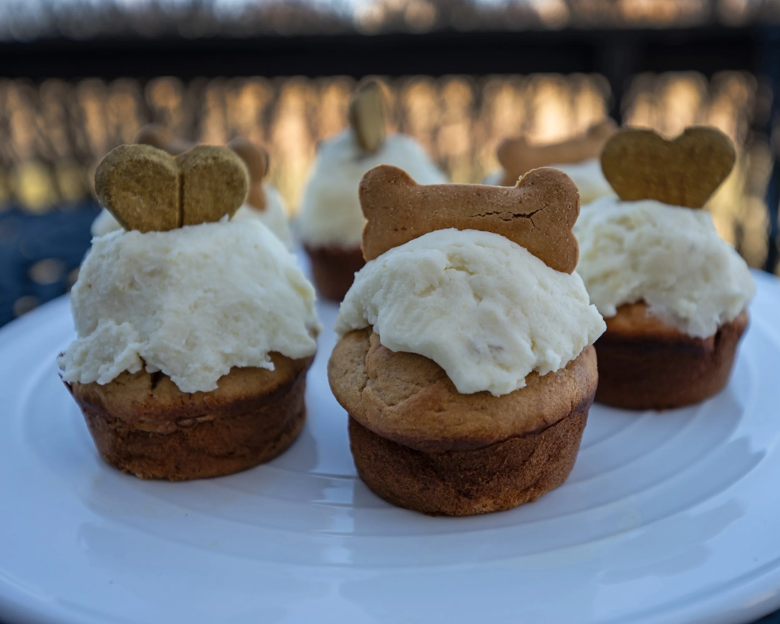 For the frosting, I whipped together potato, cream cheese, and just a touch of honey — creamy, soft, and perfectly safe for him. I topped each little cake with heart-shaped and bone-shaped treats because of course I did. He deserved something made with love.