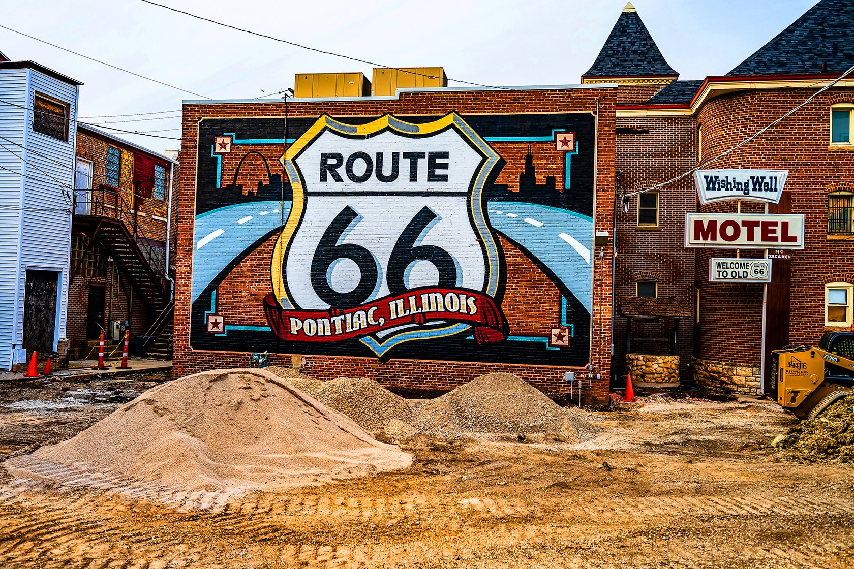 Unfortunately, Pontiac was a little less picturesque than usual because parts of the downtown area were under construction and surrounded by fencing. It made photographing some of the murals a bit more challenging, but even with the construction it was still fun to wander around and hunt for the iconic pieces of Route 66 artwork.